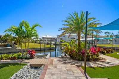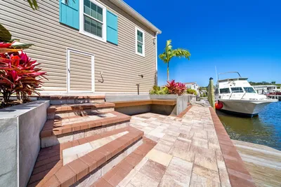 What began as a blank waterfront lot was completely reimagined into a vibrant tropical retreat. We built a full paver deck along the seawall, added synthetic turf for a lush, low-maintenance green zone, and created multiple outdoor living spaces with modern shade sails and custom landscaping. Palms, pops of color, and layered textures bring the entire space to life, transforming it into the ultimate canal-front getaway.